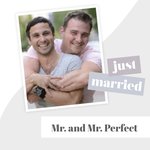 Witte fotokaart van Greetz, met zwarte tekst 'Mr. & Mr. just perfect' op de voorkant.