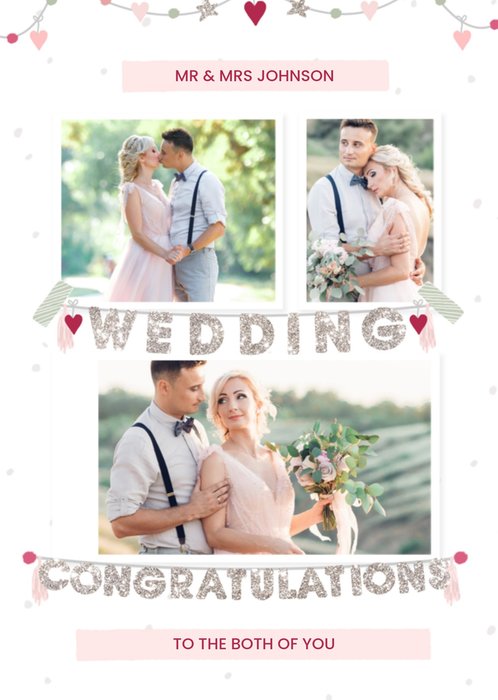 Vrolijke fotokaart met aanpasbare naam. Op de kaart staat: [naam] weddingcongratulations to the both of you.