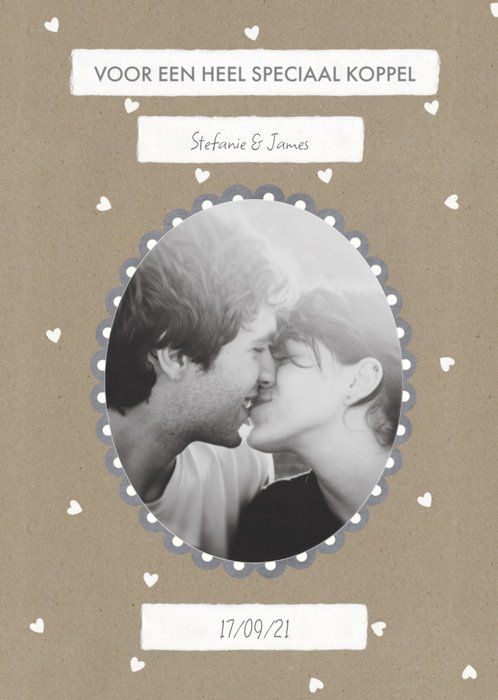 Fotokaart met naam en datum en de tekst: Voor een heel speciaal koppel.