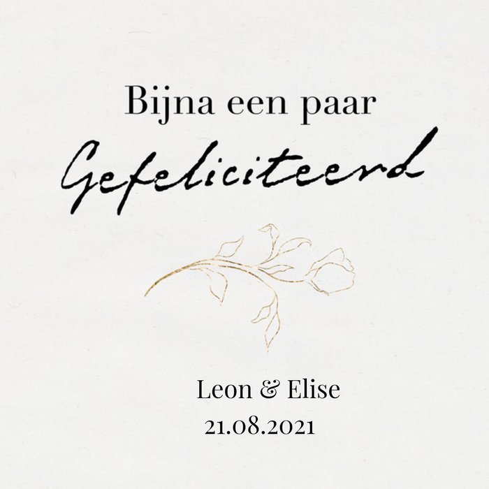Op deze huwelijkskaart staat met sierlijke letters: Bijna een paar gefeliciteerd. Je kunt een naam en datum toevoegen.