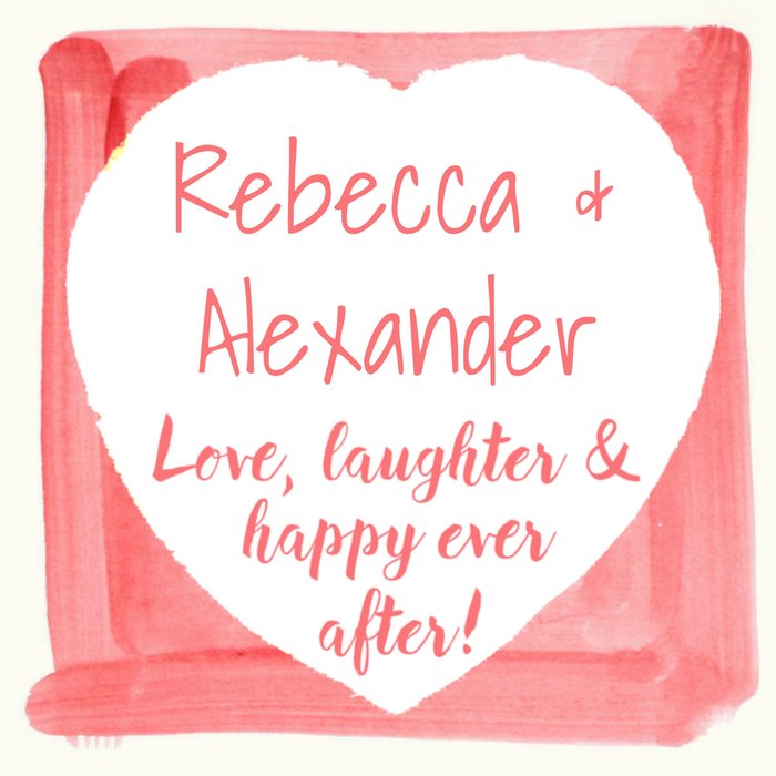 Lieve huwelijkskaart met aanpasbare naam en de tekst: Love, laughter & happy ever after!