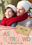 Vrolijke fotokaart met aanpasbare naam en de tekst: Pas getrouwd we wensen jullie veel geluk