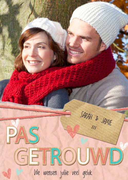 Vrolijke fotokaart met aanpasbare naam en de tekst: Pas getrouwd we wensen jullie veel geluk