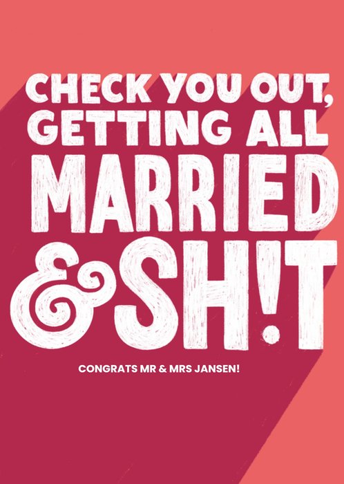 Grappige felicitatiekaart met aanpasbare naam en de tekst: Check you out, getting all married & shit.