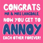 Vrolijke felicitatiekaart met aanpasbare naam en de tekst: Congrats Mr & Mrs [naam] now you get to annoy each other forever!