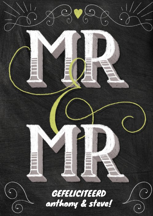 Huwelijksfelicitatie met aanpasbare naam en de tekst: Mr & Mr gefeliciteerd [namen]