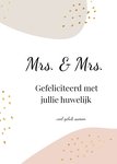 Het is feest want iemand gaat trouwen! Stuur daarom een leuke huwelijkskaart met pasteltinten van Greetz! Op deze kaart staat: Mrs. & Mrs. Gefeliciteerd met jullie huwelijk. Veel geluk samen.