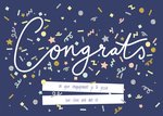 Vrolijke felicitatiekaart met confetti en aanpasbare naam.