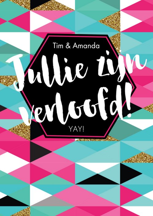 Kleurrijke kaart met aanpasbare naam en de tekst: Jullie zijn verloofd! Yay!