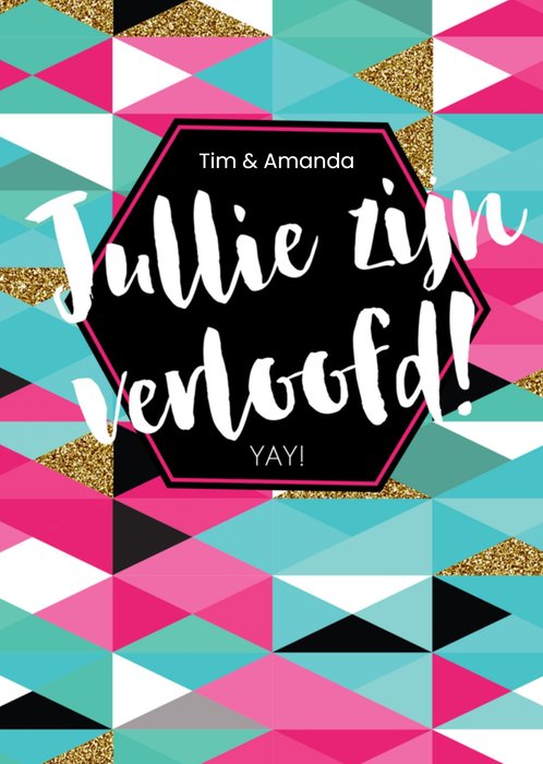 Kleurrijke kaart met aanpasbare naam en de tekst: Jullie zijn verloofd! Yay!