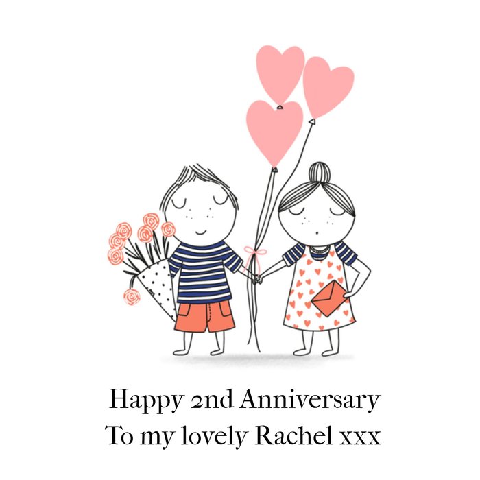 Schattige kaart met illustratie en de tekst: Happy 2nd anniversary to my lovely [naam]