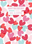 Lieve jubileumkaart met hartjes en aanpasbare naam.