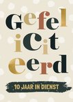 Beige kaart met in grote letters de tekst 'Gefeliciteerd, tien jaar in dienst'.