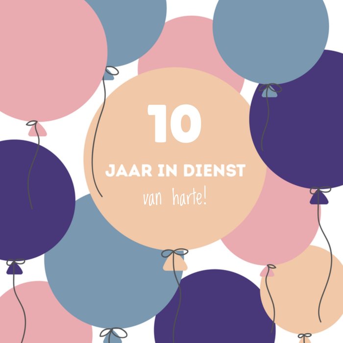 Op deze vrolijke kaart met ballonnen staat: 10 jaar in dienst, van harte!