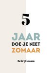 Op deze kaart staat: '5 jaar doe je niet zomaar' Onderop kan een bedrijfsnaam gezet worden.