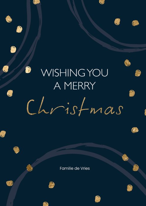 Wens vrienden en familie een gelukkig nieuwjaar met dit hippe kerstkaartje. Donkerblauw met gouden accenten en tekst: Wishing you a Merry Christmas. Je kunt jullie familienaam eronder zetten.