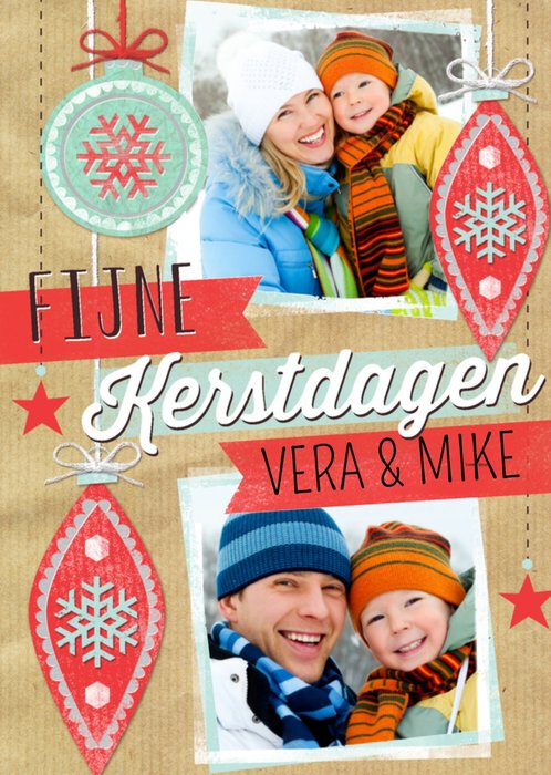 Op deze leuke kerstkaart staat: Fijne kerstdagen. Je kunt namen en foto's toevoegen.