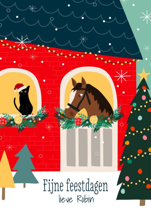 Wie ga jij deze Kerst verrassen met een kerstkaart? Doe dat dan met deze vrolijke kerstkaart van Greetz! Op de kaart zie je een leuke illustratie van een paard en kat en de tekst: Fijne feestdagen. Je kunt onderaan een naam toevoegen.
