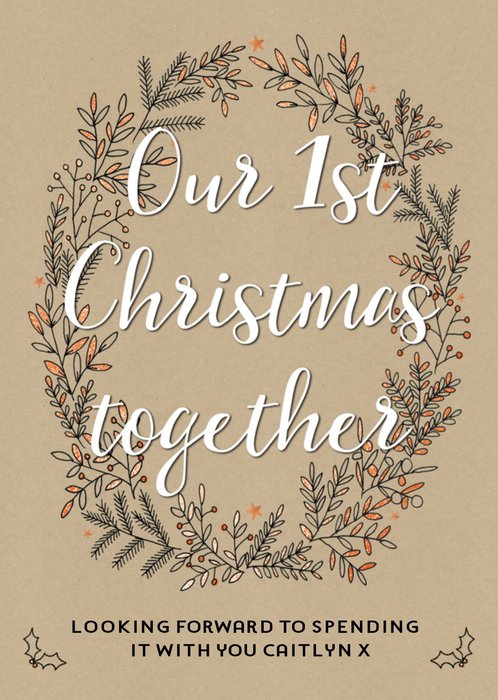 Leuke kerstkaart met de tekst: Our 1st Christmas together looking forward to spending it with you [naam]
