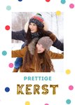 Een vrolijke kerstkaart met gekleurde stippen. Voeg jouw leukste foto toe en onder de foto staat de tekst "Prettige Kerst" deels in goude folieballonnen geschreven.