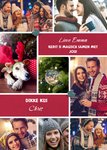 Feestelijke kerstkaart met plek voor 8 foto's en aanpasbare naam.