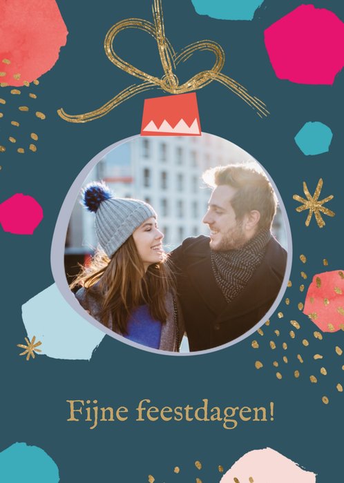 Een gezellige kerstkaart met een oud-groene tint. In de kerstbal voeg je jouw leukste foto toe.