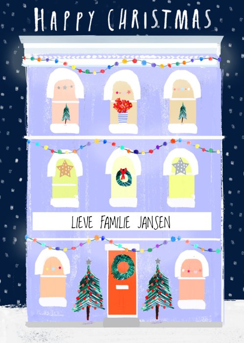 Leuke kerstkaart met huisje en de tekst: Happy Christmas lieve familie [naam]