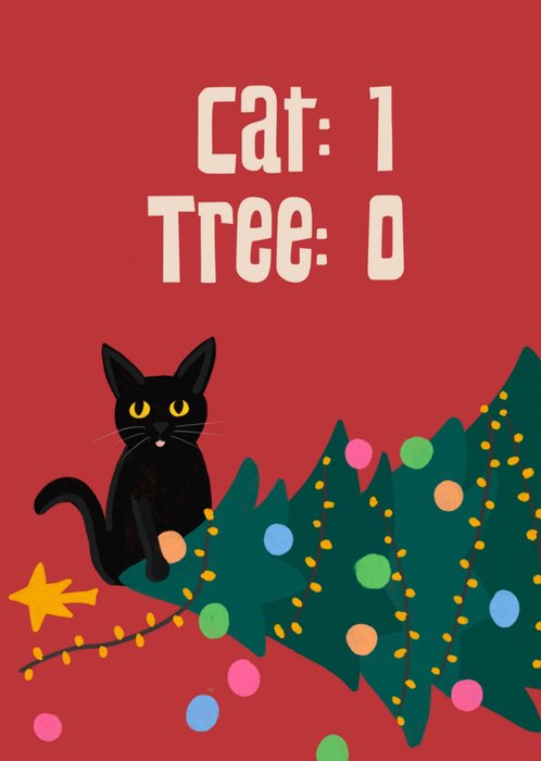 Grappige kerstkaart met illustratie en de tekst: Cat: 1 Tree: 0