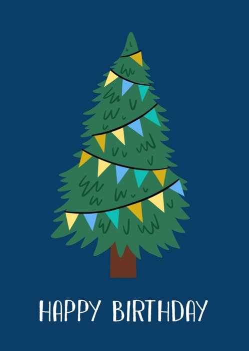 Leuke kerstkaart voor de jarige. Op de kaart staat een kerstboom en de tekst: Happy birthday
