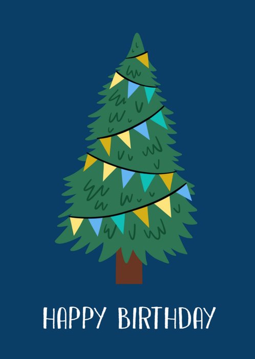 Leuke kerstkaart voor de jarige. Op de kaart staat een kerstboom en de tekst: Happy birthday