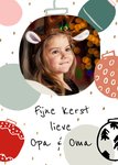Verras je opa en oma met deze mooie kerstkaart voeg een foto toe in een van de kerstballen om de kaart nog persoonlijker te maken. Op de kaart staat de tekst: Fijne kerst lieve opa en oma.