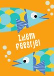Met deze oranje uitnodigingskaart kun je iemand uitnodigen voor een zwemfeestje. Op de voorkant zwemmen twee geïllustreerde gekleurde vissen.