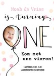 Een feestelijke uitnodiging voor een feestelijke eerste verjaardag. Op de kaart zie je een ballon met confetti. Maak de kaart extra persoonlijk door een foto toe te voegen en alle details makkelijk aan te passen.