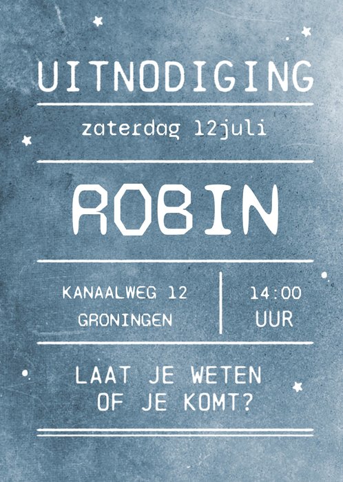 Blauwe verjaardagsuitnodiging van Greetz. Op de voorkant kan een eigen naam, datum, tijd en adres worden geplaatst.