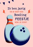 Een leuke uitnodiging voor een bowlfeestje. Op de kaart staat de tekst: Ik ben jarig en ik geef een bowling feesje. Kom je ook?