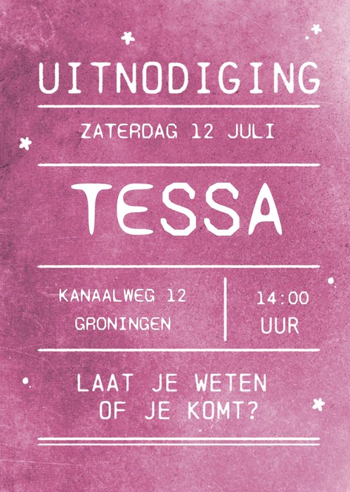 Paarse verjaardagsuitnodiging van Greetz, met eigen naam, datum, tijd en adres.