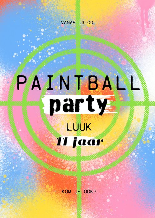 Vrolijke uitnodiging van Greetz voor een paintballparty, met eigen naam, leeftijd en tijd. Op de voorkant staan verfvlekken van een paintballgun.