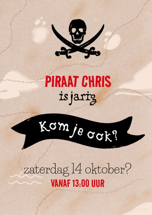 Leuke piraten uitnodiging voor een kinderfeestje. Op de kaart staat: Piraat [naam] is jarig. Kom je ook? Je kunt verder info toevoegen.