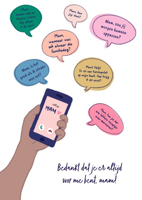 Met een illustratie van een hand die een mobiele telefoon vasthoudt en 'mama' roept, met tekstballonnen eromheen die berichten aangeven waarin een moeder veel verschillende vragen stelt.