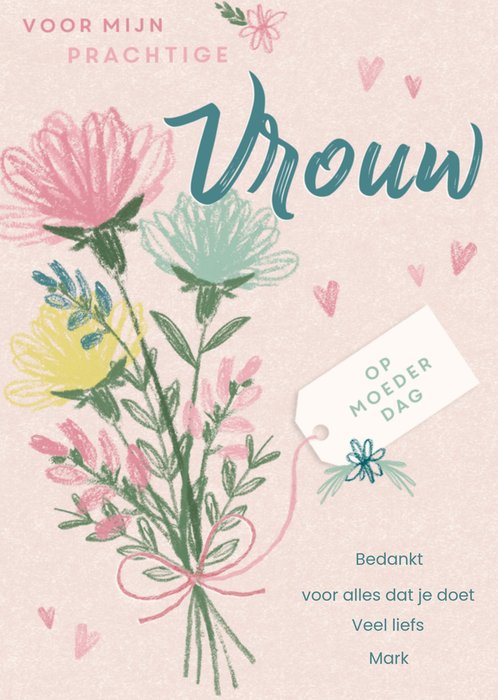 Mooie Moederdagkaart met een bosje bloemen en de tekst: Voor mijn prachtige vrouw op Moederdag.