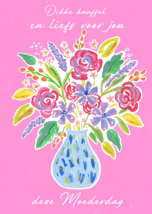 Fleurige Moederdagkaart met een vaas met bloemen, en de tekst: 'Dikke knuffel en liefs voor jou deze Moederdag.' Verras iemand met deze mooie Moederdagkaart van Moonpig.