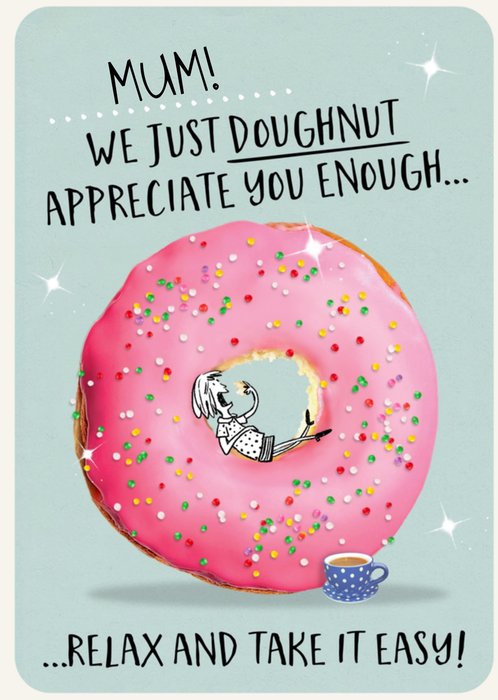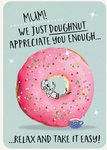 Het is bijna Moederdag. Stuur een leuke of lieve moederdagkaart van Greetz om te verrassen. Op deze moederdagkaart staat: Mum! We just doughnut appreciate you enough...relax and takt it easy.