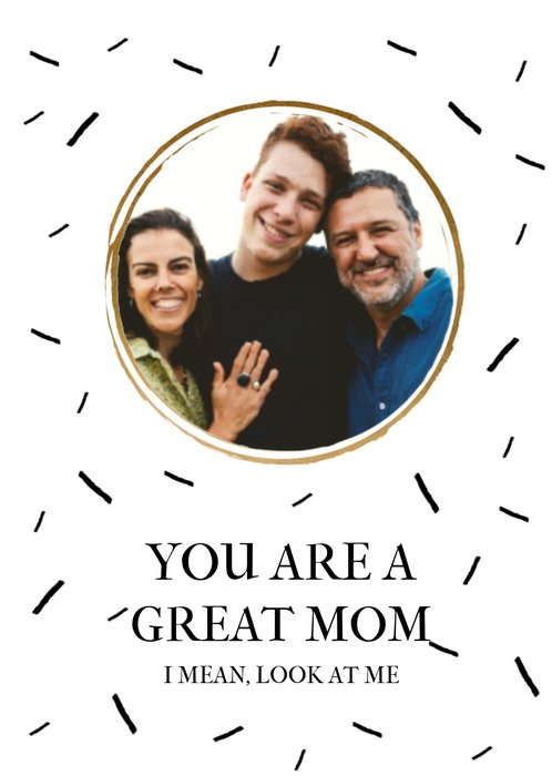 Op deze leuke moederdagkaart staatL You are a great mom. I mean look at me. Ook kun je een foto toevoegen.