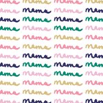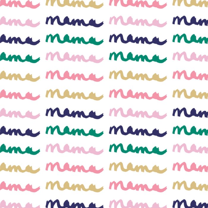 Met het meerdere keren geschreven woord "mama", dat het hele ontwerp bedekt, in veelkleurige scriptletters.