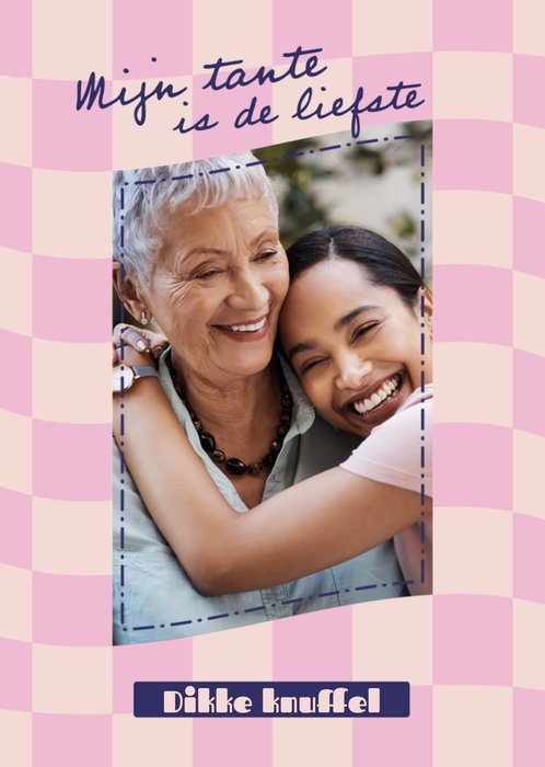 Met één foto-uploadgebied op een geruit roze en perzikkleurig patroon op de achtergrond. Er is een blauwe stippellijn aan de binnenkant van de fotolijst.