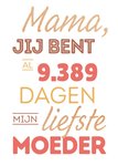 Op deze lieve moederdagkaart staat: Mama, jij bent al 9.389 dagen mijn liefste moeder. De tekst is aanpasbaar.