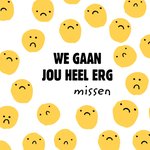 Witte afscheidskaart van Greetz, met zwarte letters en verdrietige emoticons op de voorkant en de tekst: We gaan jou heel erg missen.