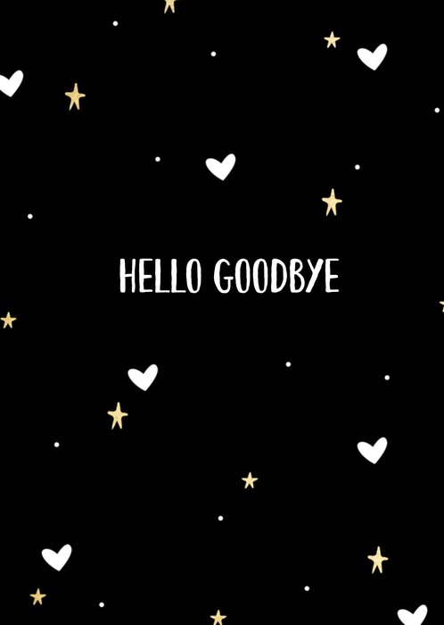 Wenskaart om zomaar te sturen, met trendy patroon van sterren, hartjes en de tekst: Hello goodbye..