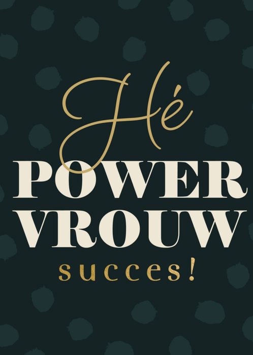 Stoere wenskaart van Greetz om iemand succes te wensen. Op de voorkant staat een tekst met: Hé powervrouw succes!