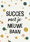 Heeft er iemand een nieuwe baan? Wens hem of haar succes door middel van deze kaart. De kaart wordt gevuld met blauwe stippen. In het midden van de kaart staat de tekst 'Succes met je nieuwe baan'.
